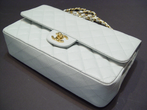 샤넬 캐비어 하늘색 클래식 숄더백 캐비어와 금장 체인이 매치된것으로 너무나 산뜻하며, 동시에 클래식한 멋을 느낄수 있는 백 입니다 사용으로 자연스러운 때와 스크래치, 마모 조금 외에는 별다른흠 없이 양호합니다