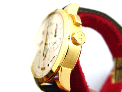 Crown Material: 18k Rose Gold, starts watch, winds power-reserve clockwise, chronograph counter-clockwise, hrs, mins